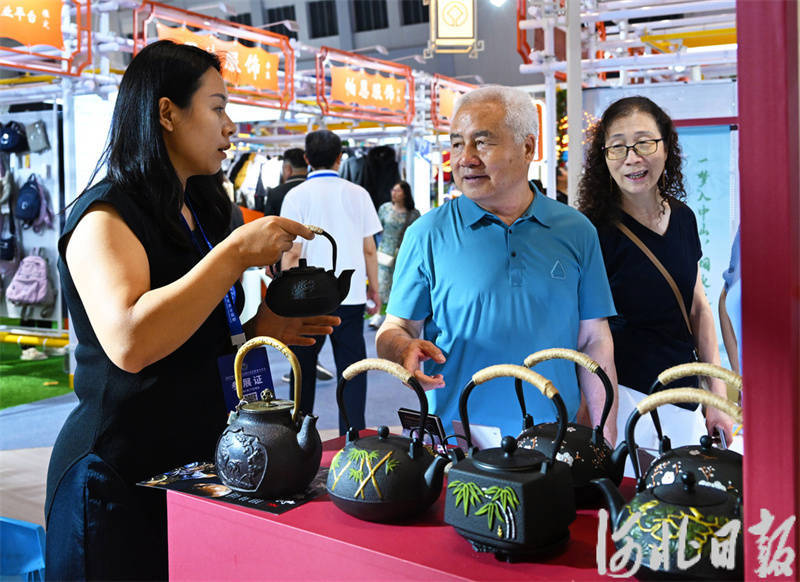 6月19日,在2025年廊坊经洽会多业态融合消费市集定州展位前,观众选购利用创新冷铸工艺生产的河北老字号煮世铁壶。