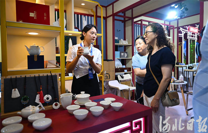 6月19日,在2025年廊坊经洽会多业态融合消费市集定州展位,参展商为观众介绍正清和定瓷产品制作技艺。