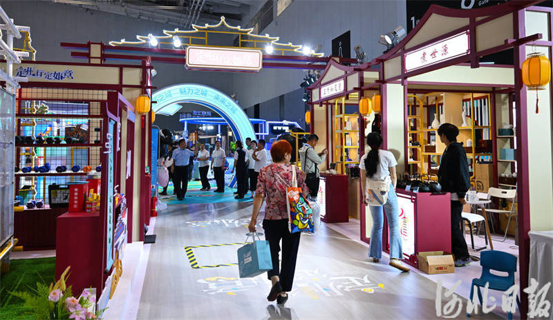 6月19日,参观者在2025年廊坊经洽会多业态融合消费市集定州展位参观、选购文创产品。