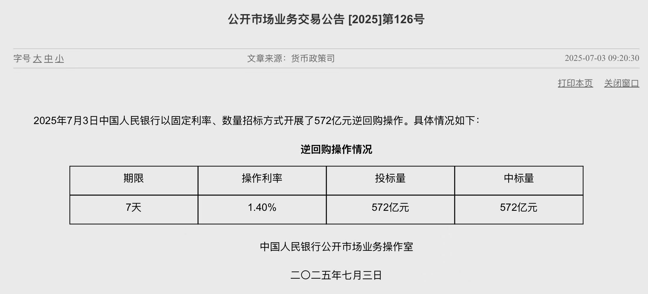 据中国人民银行网站消息,7月3日,央行开展572亿元7天期逆回购操作,操作利率1.4%,与此前持平。因今日有5093亿元7天期逆回购到期,当日实现净回笼4521亿元。